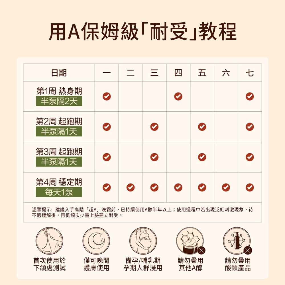 1. 孕期或哺乳期請勿使用視黃醇類產品。