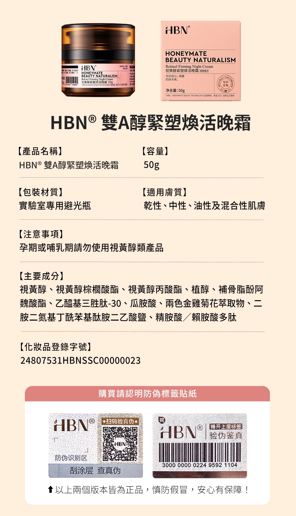 品名:【HBN官方】雙A醇緊塑煥活晚霜 50g (雙A晚霜3.0)