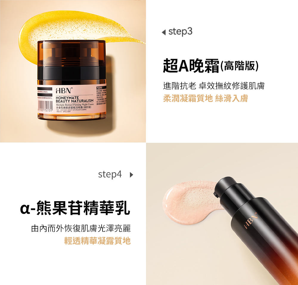 品名:【HBN官方】早C晚A水乳雙霜亮白組 (特證版發光水+雙A乳+超A晚霜+原白霜)