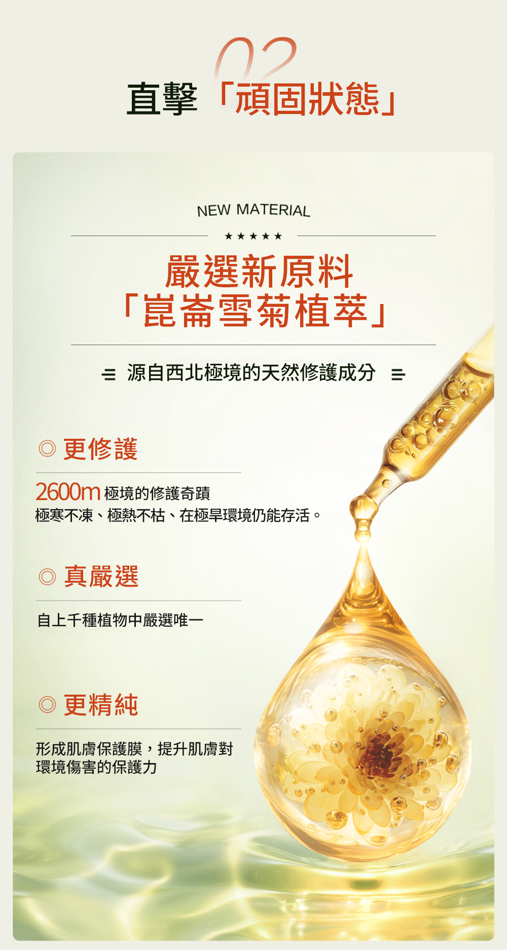 材質:泛醇、雪菊(兩色金雞菊花提取物)、纖連蛋白、羥基積雪草苷、肽可舒